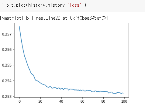 손실 그래프를 봤을 때 loss 가 잘 줄어드는 것 처럼 보이지만 사실상 0.257~ 0.253 사이에서 줄어드는걸로 봐선