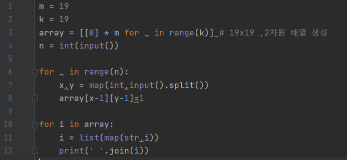 흰 돌이 있는 위치는 1, 없는 곳은 0으로 출력한다.