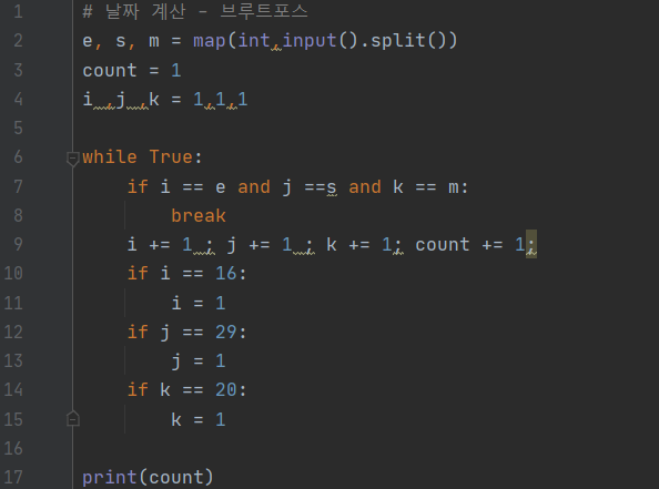 준규가 사는 나라는 우리가 사용하는 연도와 다른 방식을 이용한다. 준규가 사는 나라에서는 수 3개를 이용해서 연도를 나타낸다. 각각의 수는 지구, 태양, 그리고 달을 나타낸다. 지구를 나타내는 수를 E, 태양을 나타내는 수를 S, 달을 나타내는 수를 M이라고 했을 때, 이 세 수는 서로 다른 범위를 가진다. (1 ≤ E ≤ 15, 1 ≤ S ≤ 28, 1 ≤ M ≤ 19)