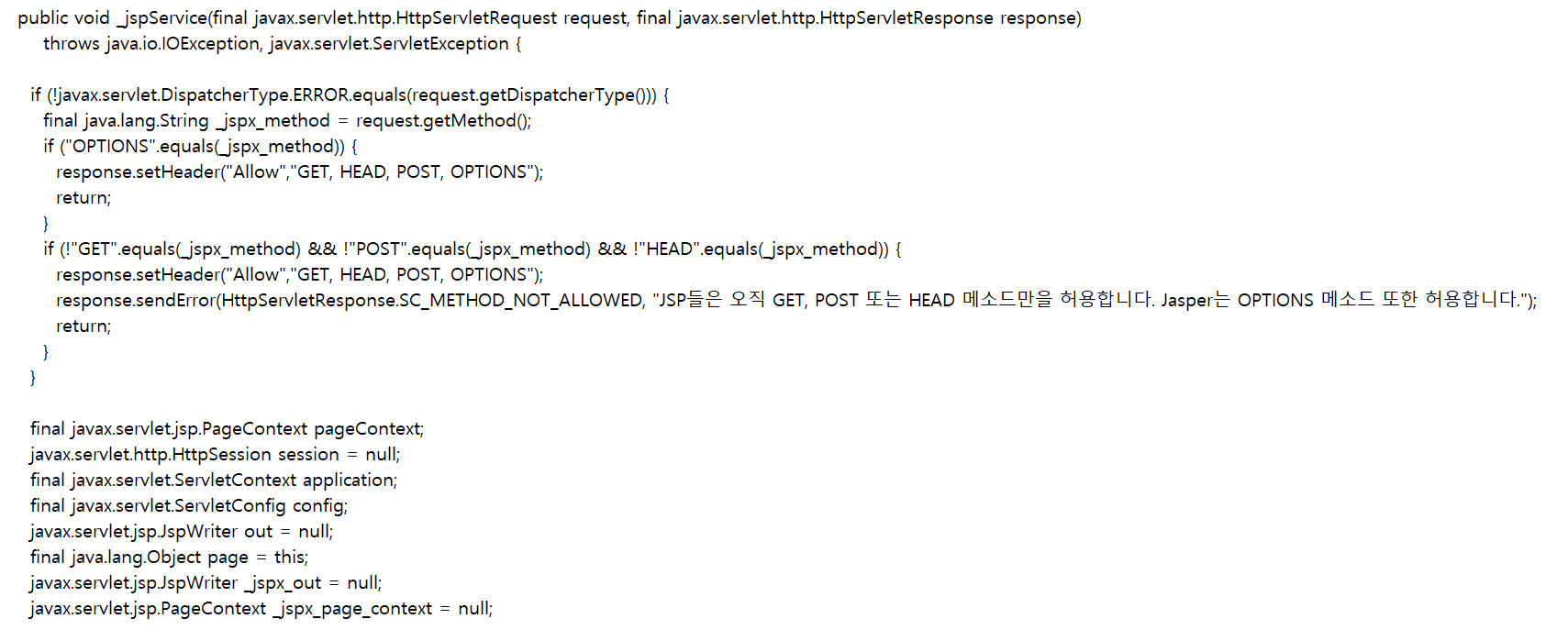 메서드 매개변수인 request, response 와 지역변수로 선언된 pageContext, session, application, config, out, page 등을 볼 수 있다. 이러한 초기화 부분 이후에 사용자가 작성하는 코드가 위치하므로 해당 JSP 파일에서는 프로그램을 작성할 때 내장 객체를 별도로 선언하지 않아도 사용할 수 있는 것이다.