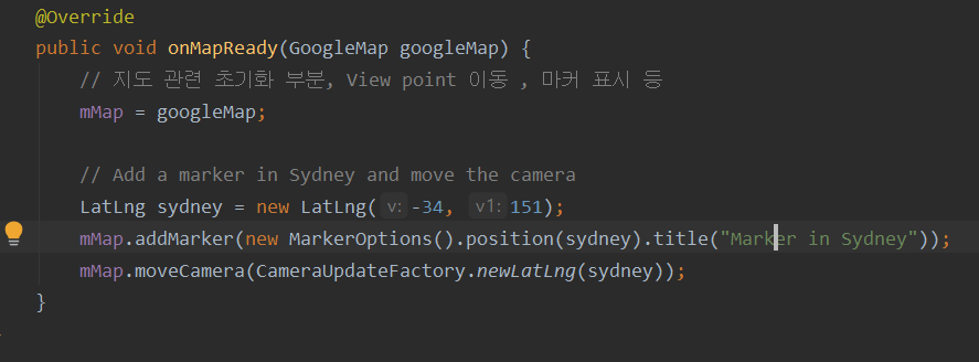 MapsActivity.class 의 이 메서드 부분 때문인데, 위치를 옮기고 싶다면 위도 경도를 바꾸고, 마커를 눌렀을 때 해줄 일을 설정할 수 있다. (위도 경도는 googlemap 에서 원하는 장소를 지정하고 오른쪽 마우스 클릭하면 값을 가져올 수 있다. )
