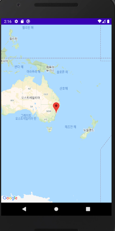 4. 실행해보면 지도 마커가 시드니에 위치되어 있다.
