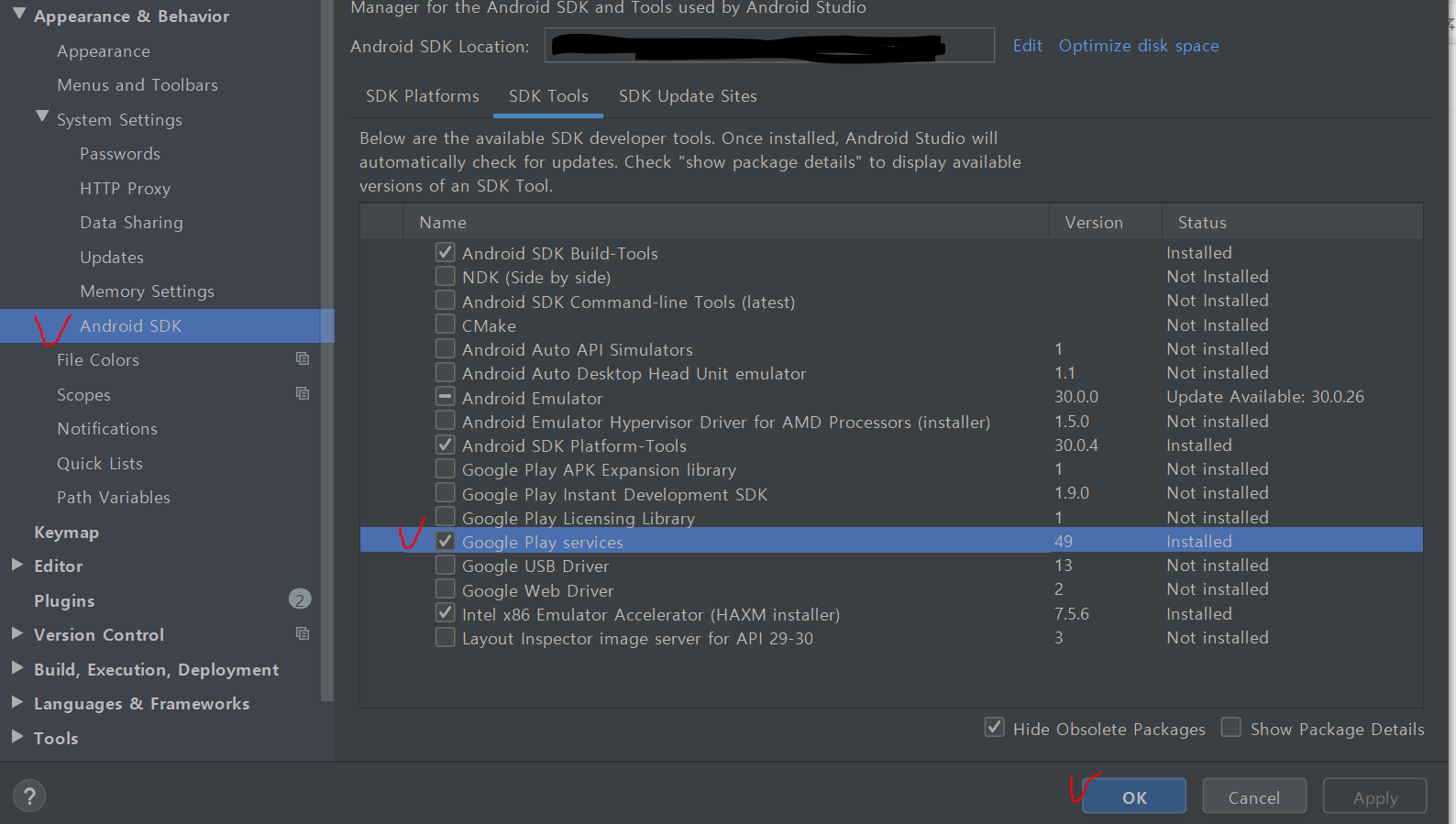 Settings 에 가서 android SDK - SDK Tools 에서 Google Play services 가 설치되어 있어야한다.